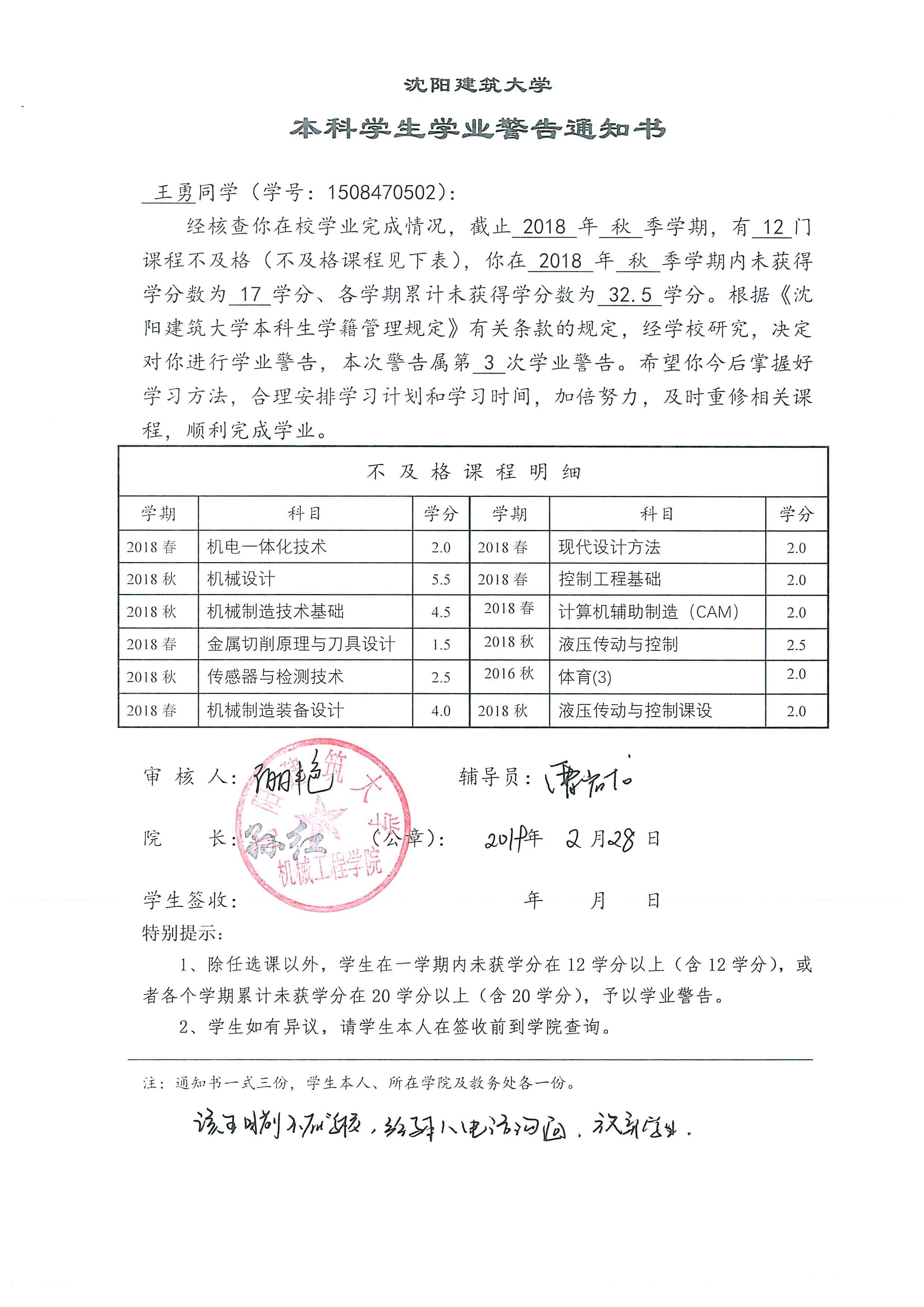 根据以上文件规定,现将无法送达本人的学业警告通知书进行公示,公示期为2019年3月1日-3月3日。具体公示内容如下: