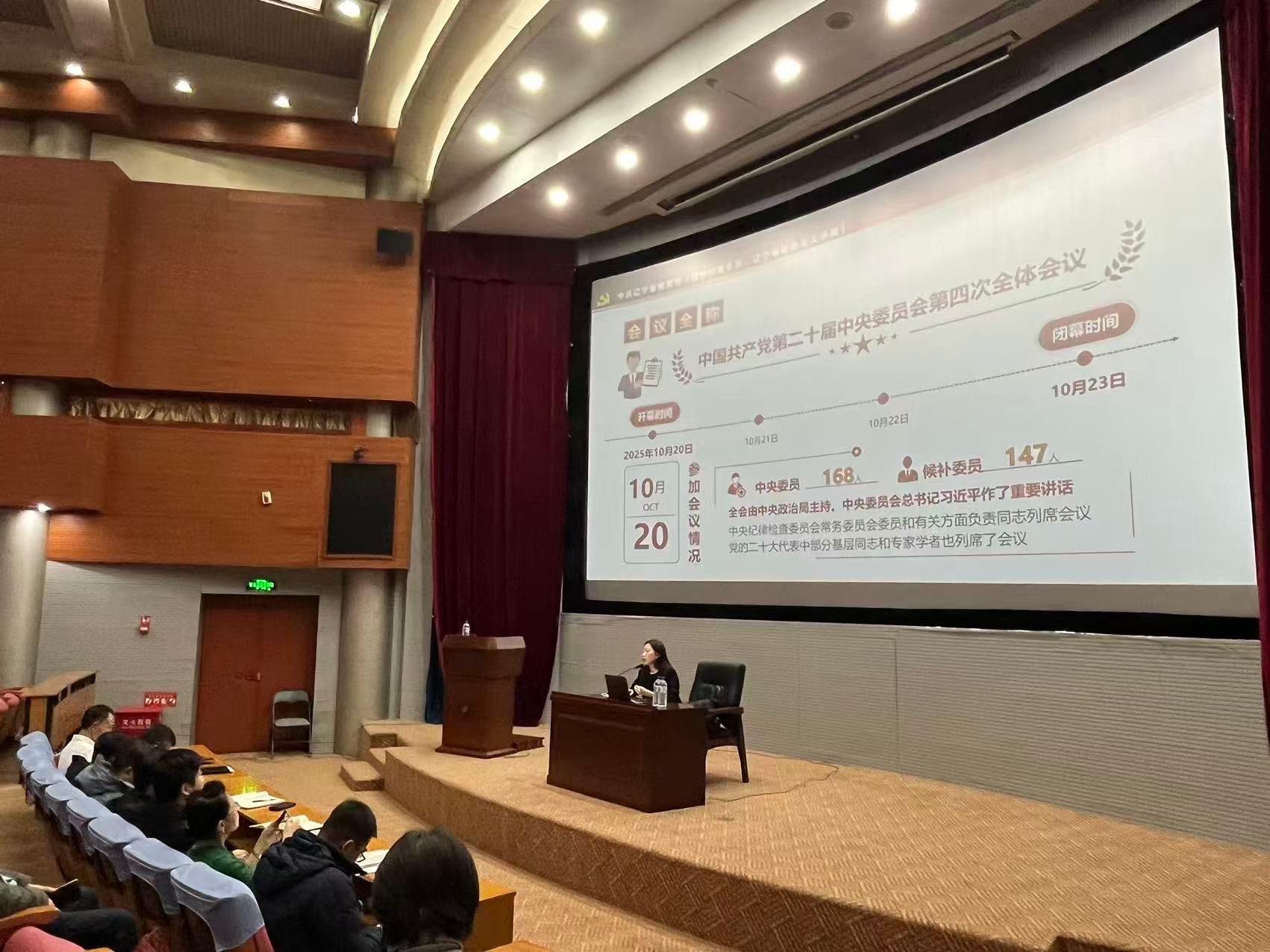 宣讲会邀请中共辽宁省委党校社会建设与生态文明教研部教师慕彧玮作专题辅导。慕彧玮以“以高质量发展扎实推进中国式现代化”,围绕党的二十届四中全会的重大意义、核心要义和实践要求,结合国内外经济社会发展形势及辽宁省的发展实际,对党的二十届四中全会精神进行详细解读。宣传会内容丰富、重点突出、系统全面,充分运用典型案例、翔实数据进行讲解,帮助师生深化了对全会精神的理解和把握。