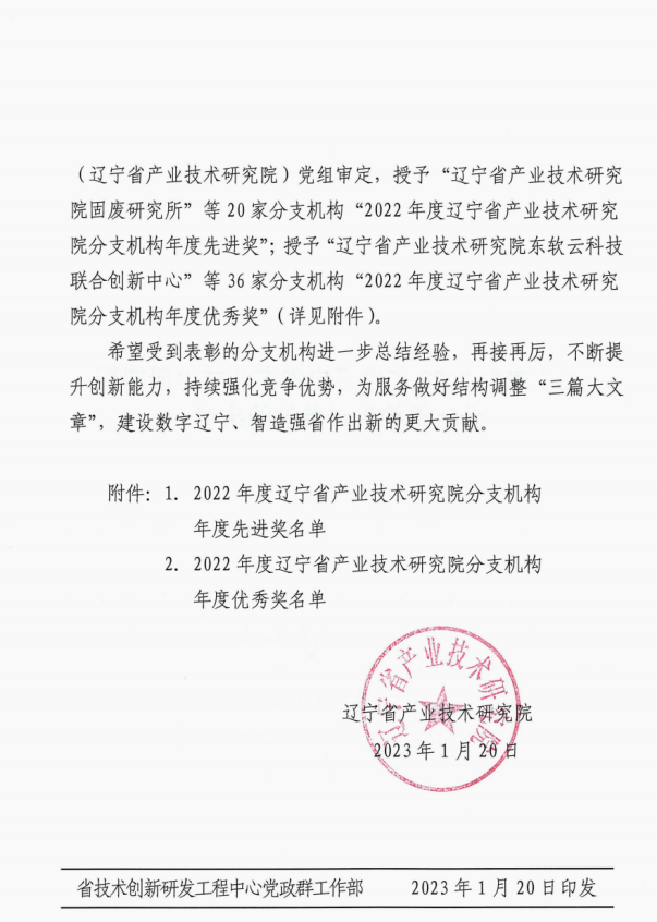辽宁省产业技术研究院分支机构组建于2020年,旨在进一步优化我省科技资源配置,推动科技成果转化,建设数字辽宁、制造强省。本次为表彰先进、树立典型,调动各方面积极性与创造性、营造良好科技创新氛围,决定对智能建筑装备信息技术研究所等20家发展成效显著的2022年度辽宁省分支机构单位授予表彰。